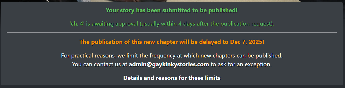 Authors do not have to take care if they comply with this rule. If an author attempts to publish a new story or chapter too soon after their previous story or chapter, the system will notify them and automatically delay the publication. The author will then see a message like this: